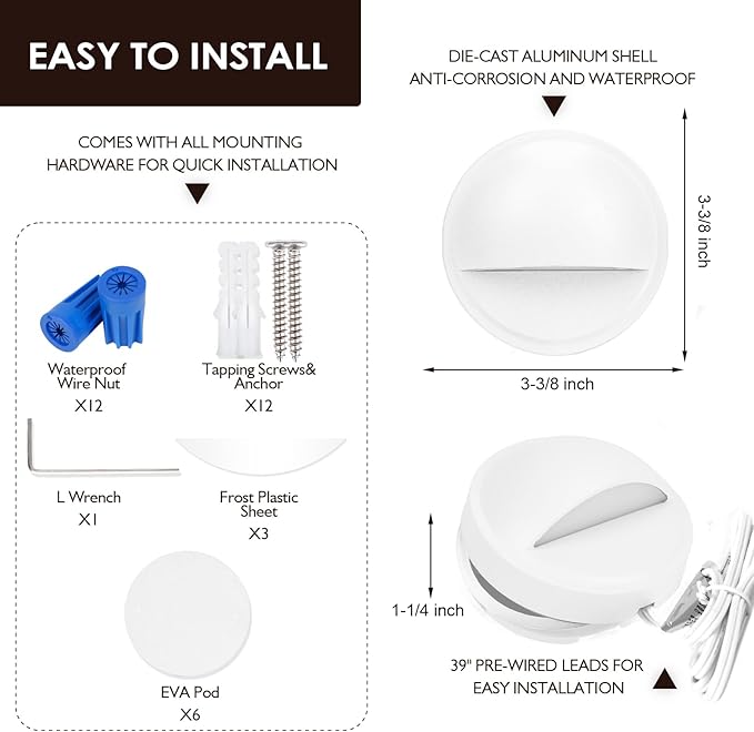- Waterproof & Widely Use :The light is made of solid die-cast aluminum IP65 waterproof rating makes the Deck Lights can work well under all kinds of bad weather, such as rain, storms, snow or frost weather. The deck lights can be widely used on fence, gardens, terraces, yards, sidewalks, outdoor stairs, park squares, etc