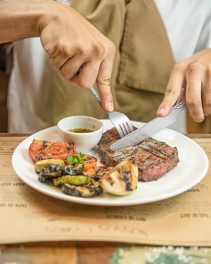 - Classy And Ergonomic Design: Distinctive with the silver tableware set double-sided hammered patterns on utensils set handles, reasonable balance of weight for ergonomic design. Perfect for both adults and big children, it offers a comfortable grip and an eye-catching look that sets it apart from the rest.