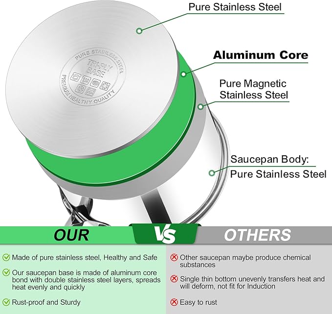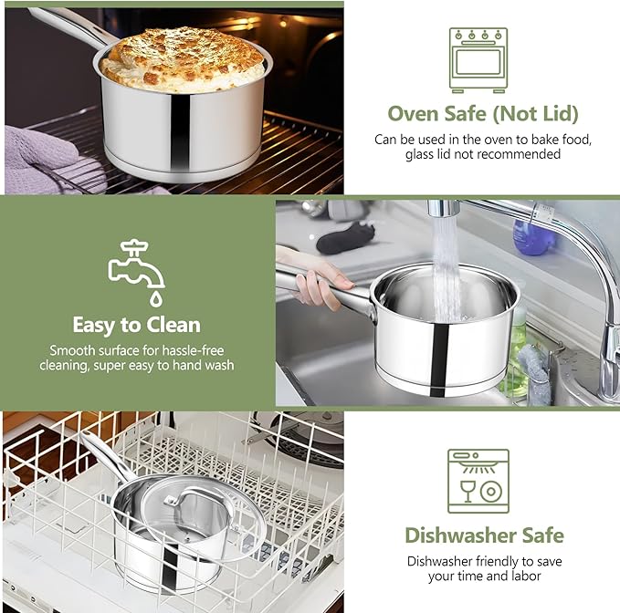- FAST & EVEN HEATING : The bottom of saucepan with tri-ply construction(pure stainless steel inner, aluminum core and pure stainless steel outer) could bear high temperature, Transferring heat quickly and evenly from base, Fits for various cooking stovetops, Including induction, glass top, electric, gas, ceramic, halogen etc., Also can be used in the oven (Not Included Lid)