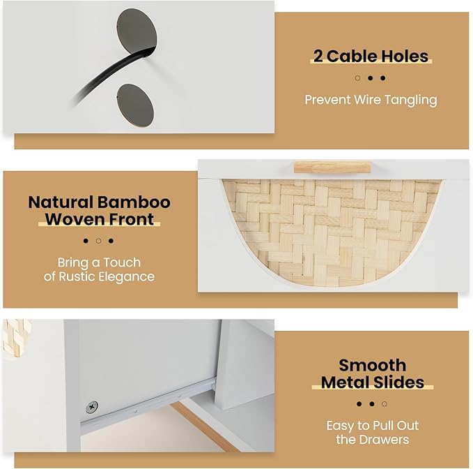 - Mid-century Modern Flair: Elevate your living space with our mid-century modern TV stand! Its clean white finish and timeless bamboo-woven drawer fronts blend effortlessly with a variety of decoration styles, offering both sophistication and functionality.