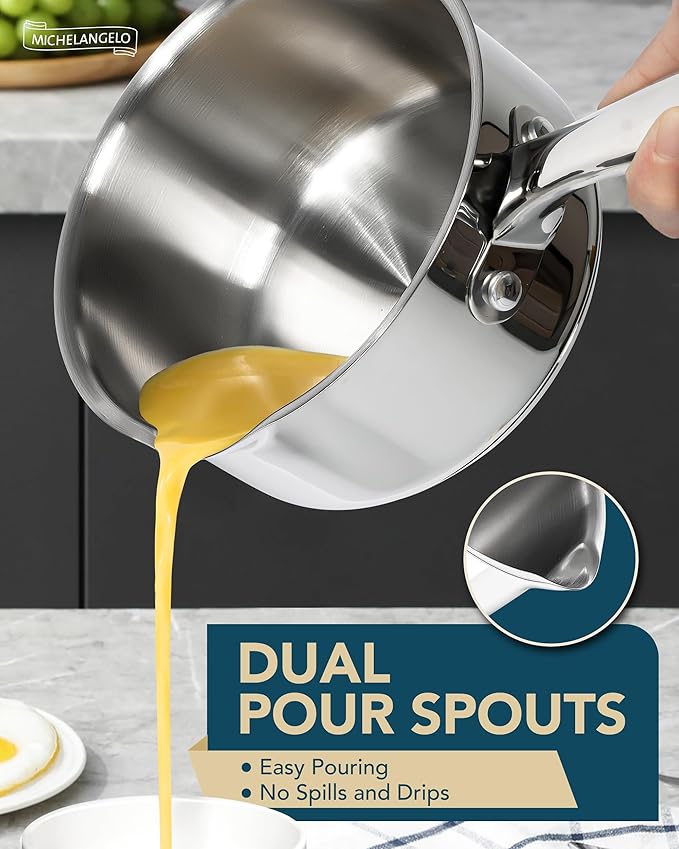- Improved Pouring: The built-in pour spout and flared edge of each saucepan ensures smooth, drip-free pouring, perfect for transferring liquids with precision, allowing liquids to be poured pan-to-plate without messy spills or drips.