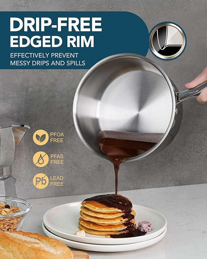 - Improved Pouring: The flared edge of each sauce pan provides a drip-free pouring experience, allowing liquids to be poured pan-to-plate without messy spills or drips.