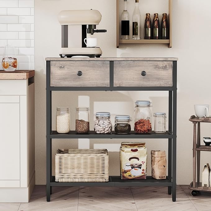- 3-Tier Storage Spaces console table: The 3-tier narrow console table includes 2 dense mesh shelves and 2 spacious non-woven fabric drawers below the wooden top. 2-tier open shelf design allows you to place books, vases, DVDs, storage boxes, etc. assuring your desktop is more tidy and satisfying your various needs