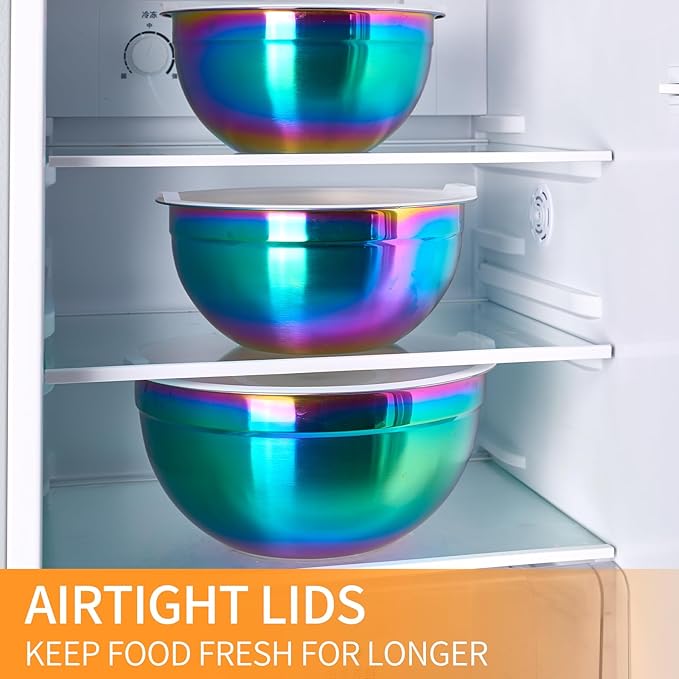 - 【Plastic Lids Included】: BPA free airtight lids keep your recipes fresh for longer in the refrigerator, when marinating, or when you need serving bowls, a great choice for food storage; a deepening basin type is ideal for mixing ingredients without any splash; non-skid silicone bottoms would prevent slippage during prep.