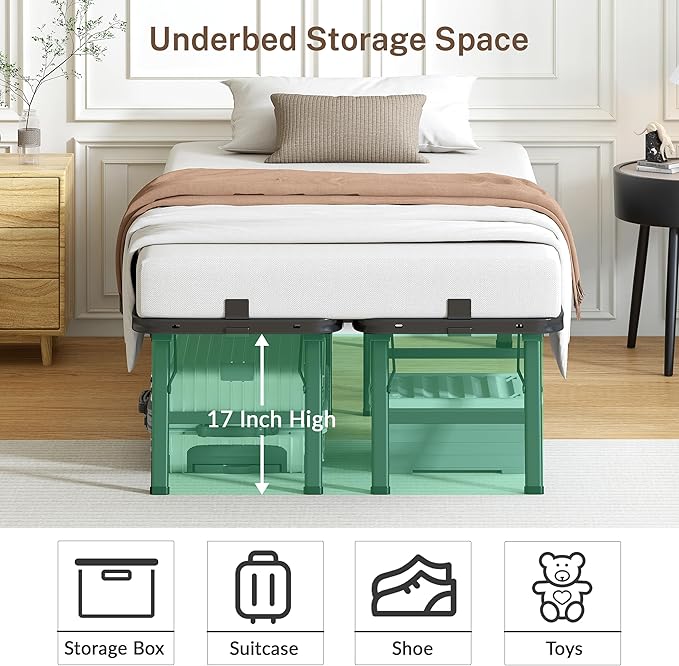 - Ample Under-Bed Storage Space: The 18-inch steel mattress frame provides generous under-bed storage space, with a clearance height of 17 inches. This allows for valuable storage of extra belongings, keeping your room organized and clutter-free.