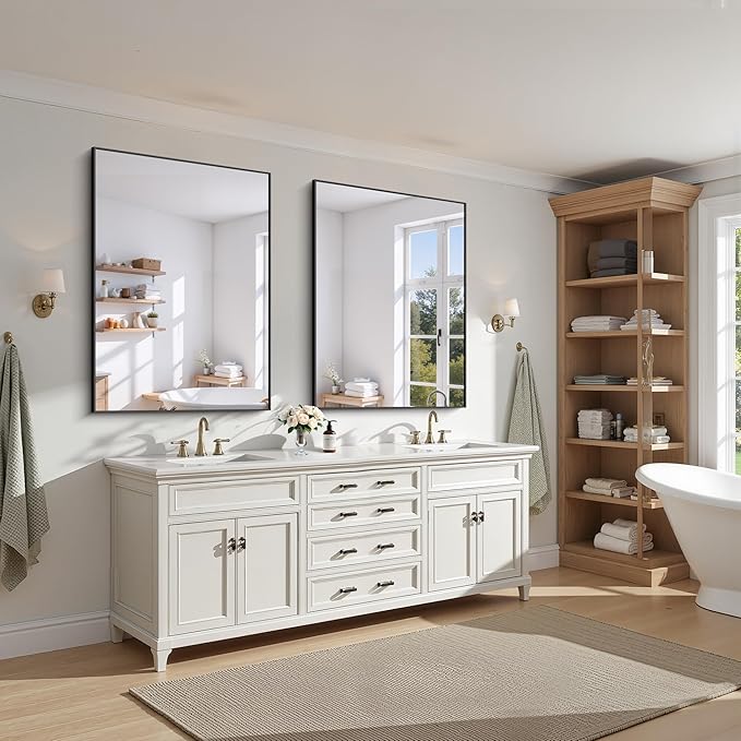 - Easy Installation & Secure Package:The package for this rectangle bathroom mirror is well and securely designed with all-around protective styrofoam with passed drop test. no worry about the breakage. The metal framed mirror designed with 4 built-in slots on the back for hanging horizontally or vertically. Super easy to install. Installation guideand screws bag are included in the package