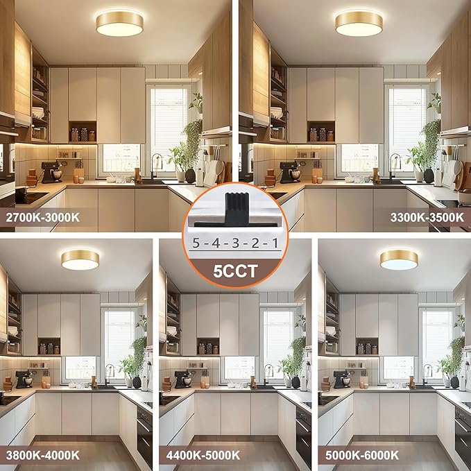 - Five Color Temperature Settings & Brightness Adjustable: YURNYQ ceiling light flush mount offers five color temperature settings (2700 K-3000 K, 3300 K-3500 K, 3800 K-4000 K, 4400 K-5000 K, 5000 K-6000 K) to meet various CCT needs, ranging from warm white to daylight. Simply toggle the button in the fixture to choose CCT before installation. The brightness can be adjusted from 10%-100% with a dimmer switch (NOT included). The close to ceiling light can meet your various needs
