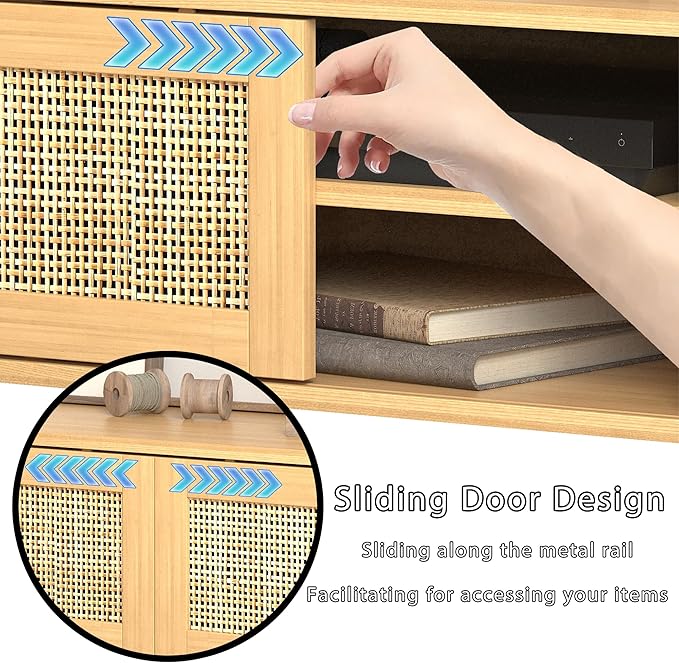 - 【Chic Appearance】Rattan-decorated doors match the natural surface, this TV stand with storage blend of midcentury modern and boho that adds a cozy stylish touch to your space. Whether you are in a dorm room, apartment or house, this TV cabinet can add novelties and charm to your house and make your home feel more like home