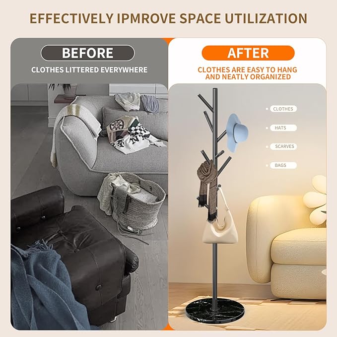 - 100% NATURAL MARBLE BASE:This coat rack freestanding is made of 100% natural marble. Carefully selected natural marble, each piece has a unique vein carved by nature (not a quality issue). The base is 11.81 inch in diameter and 1.18inch in thickness, very solid and able to support up to 180LBS, hang heavy winter coats and briefcases very firmly without wobbling
