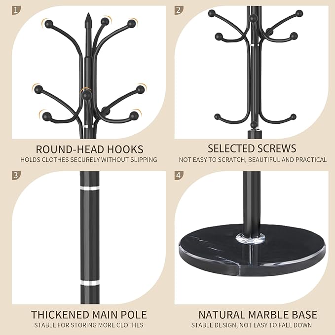 - 100% NATURAL MARBLE BASE:This coat rack freestanding is made of 100% natural marble. Carefully selected natural marble, each piece has a unique vein carved by nature (not a quality issue). This base is capable of supporting 180LBS, hanging heavy winter coats and briefcases very firmly without wobbling