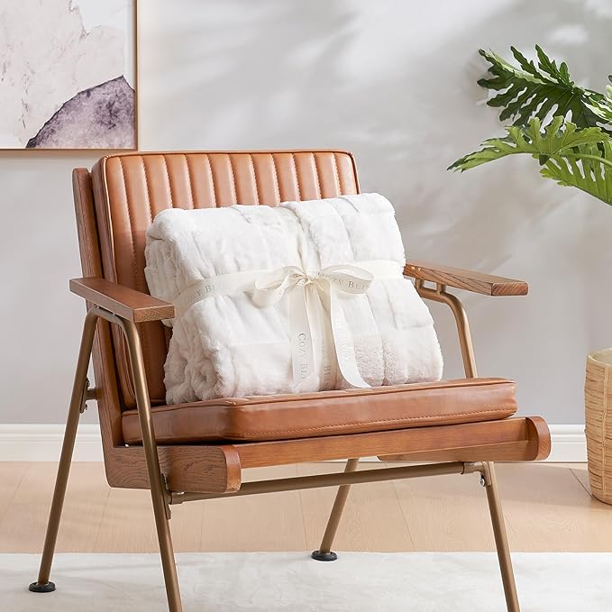 Cozy Bliss Checkered White Large Faux Rabbit Fur Twin Bed Blanket, Soft Fuzzy Fluffy Minky Cream Furry Blankets for Couch, Bed, Adults (60 * 80 Inches Ivory)