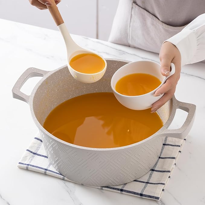 - SAFE COATING - Our Cast Aluminum pots and pans are non-toxic and safe to use for your everyday cooking. Cookware without the chemicals that can be used as a soup pot, sauce pan, skillet or non stick frying pan set. with superb food release and easy cleanup. Hand wash recommended to maintain the nonstick finish.