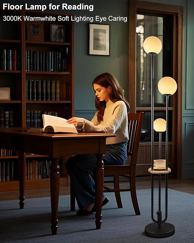 - Modern elegant& Eye-Caring:The high-quality mid century floor lamp globe frosted lampshade diffuses light evenly,reducing glare while providing a cozy, eye-friendly glow.Combination of three sphere lampshades and black elements makes this shelf floor lamp ideal for bohemian industrial, farmhouse,rustic or modern minimalist home styles.