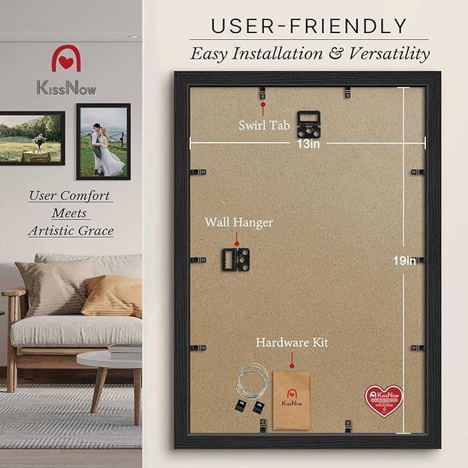 - User-friendly & Versatile: An easy-to-install frame that comes complete with hanging hardware for both horizontal and vertical display. Ideal for 13x19 photos, its unique spin-lock design allows for effortless picture loading.