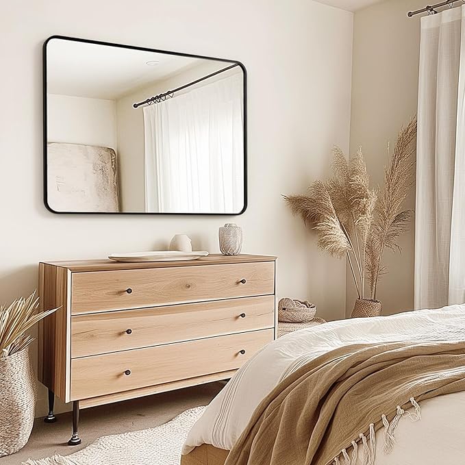 - 【Minimal Decor】 The modern shape and the deep inset of the glass surrounded by the matte black finish of the frame gives this mirror a soft, contemporary feel