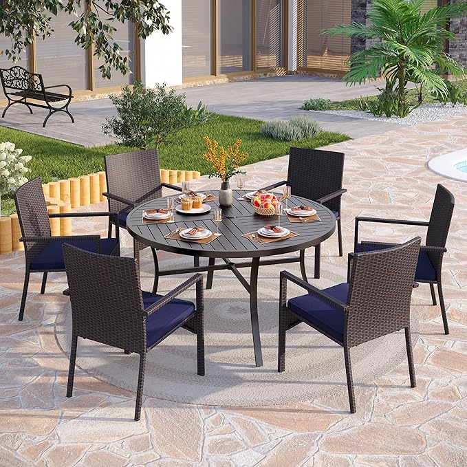 PHI VILLA 7 Pieces Outdoor Round Dining Set for 6, Large Wrought Iron Dining Table with Umbrella Hole & Cushioned Wicker Rattan Chairs, Dining Furniture Set for Patio, Deck, Yard, Porch