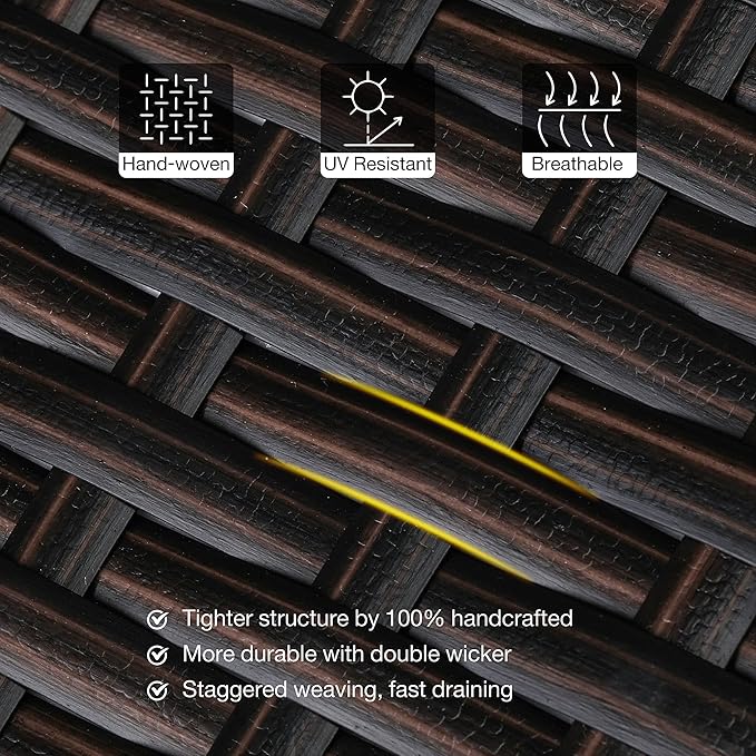 - 【Rattan Chairs with Cushions】 Made of tightly woven weather-resistant wicker, UV & fade resistant. Natural texture wicker material with strengthened dual-wrapped edges, much more durable and stronger than normal rattan material. With 1.97" thick padded cushion, providing comfortable support for long time sitting.