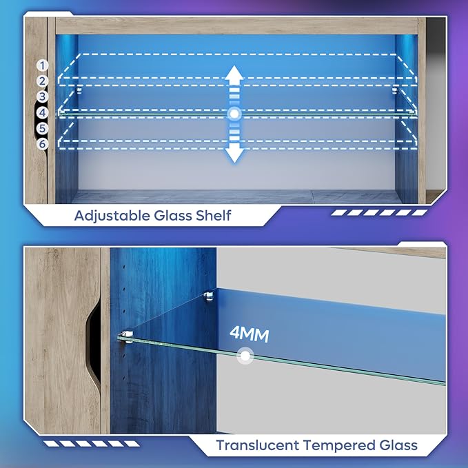 - 【Adjustable Tempered Glass Shelves】The black TV stand features adjustable tempered glass shelves that can be set to 5 different heights. These shelves offer a sturdy platform for your items. When illuminated by LED lights, your TV cabinet create an eye-catching display, show your treasured items beautifully.