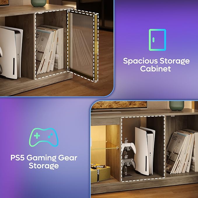 - 【Efficient Storage Solution】Bestier TV stand is designed with open storage space and 2 closed cabinets. The acrylic door protects equipment from dust while maintaining visibility. Its 3-tier multi-compartment layout providing ample storage space for PS5, Xbox, media devices and gaming consoles. Cable management holes at the back ensure a clean appearance.
