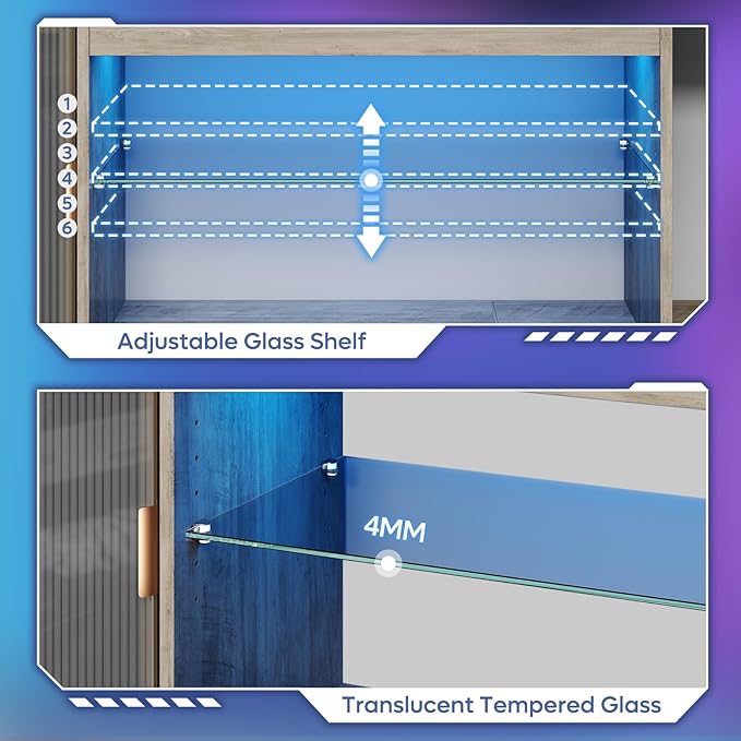 - 【Adjustable Tempered Glass Shelves】The black TV stand features adjustable tempered glass shelves that can be set to 5 different heights. These shelves offer a sturdy platform for your items. When illuminated by LED lights, your TV cabinet create an eye-catching display, show your treasured items beautifully.