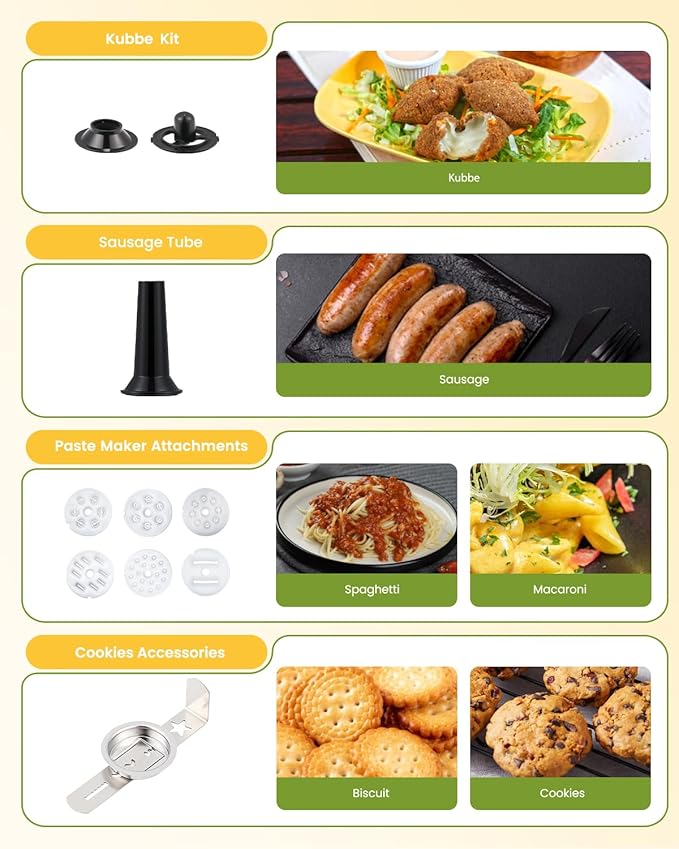 - 7-in-1 Multifunctionality: Includes a large 6.5-quart stainless steel bowl (holds 20+ eggs), meat grinder, 1.5L juicer, and attachments for cookies, sausages, and pasta. Handles doughs, batters, whipping, grinding, juicing, and more