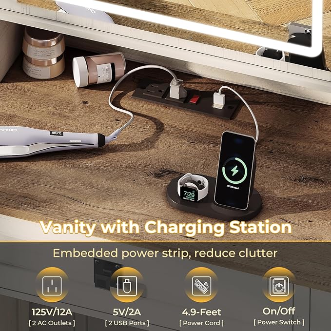 - [MAKEUP VANITY WITH CHARGING STATION] Equipped with a charging station, including 2 standard plug sockets and 2 USB ports, which is more convenient for connecting hair dryers, curling irons, etc., and can also charge your mobile phone/tablet/smartwatch. Includes a power switch that can be controlled with one button, making it more convenient to use