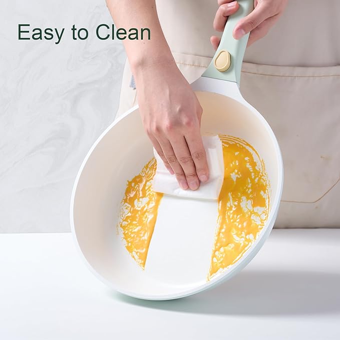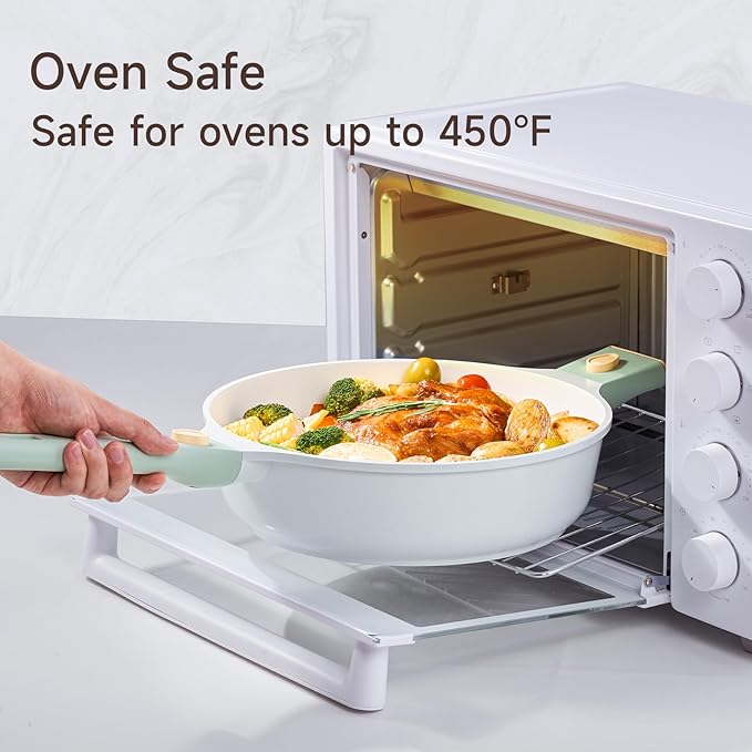 - Heat Safe &Oven Cooking: These ceramic pots and pans are light weight! They work extremely well and have very even heating. Low or medium heat is recommended. The non stick cooking set is oven-safe up to 450°F, this allows you to seamlessly transition from stovetop cooking to baking or finishing a dish in the oven, but remove the handle before placing it in the oven.