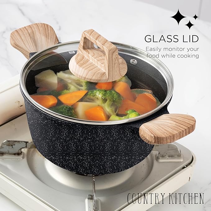 - SET INCLUDES - A complete kitchen essentials set, you're getting a total of 10 cookware pieces and 4 silicone utensils. Including an 3 qt casserole pot with glass lid, a 4 qt casserole pot with glass lid, a steamer, an 11” frying pan, an 8” frying pan, a 11" deep frying pan with glass lid, and a 2 qt sauce pan with glass lid. These beautiful cookware sets are designed with a speckled coating and woodlike handle. Not only functional, but these sauté pans are decorative as well.