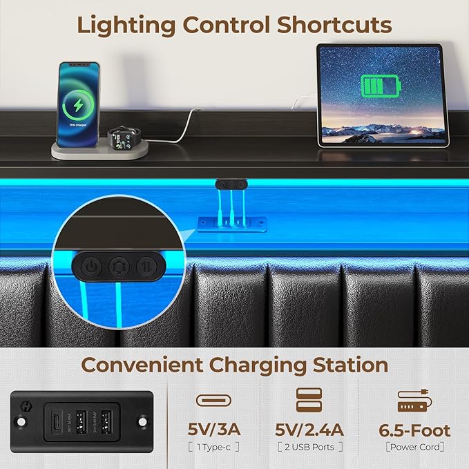 - Adjustable LED System & USB and Type C Port: Control these LED lights with ease using the app. With over 60,000 DIY color options, you can set the perfect mood for any music genre. Additionally, the lights can be synced to music or your recordings, creating a dynamic and immersive atmosphere for your party. It can also provide you with a convenient charging station, keeping your mobile phone powered so you can relax in bed Available