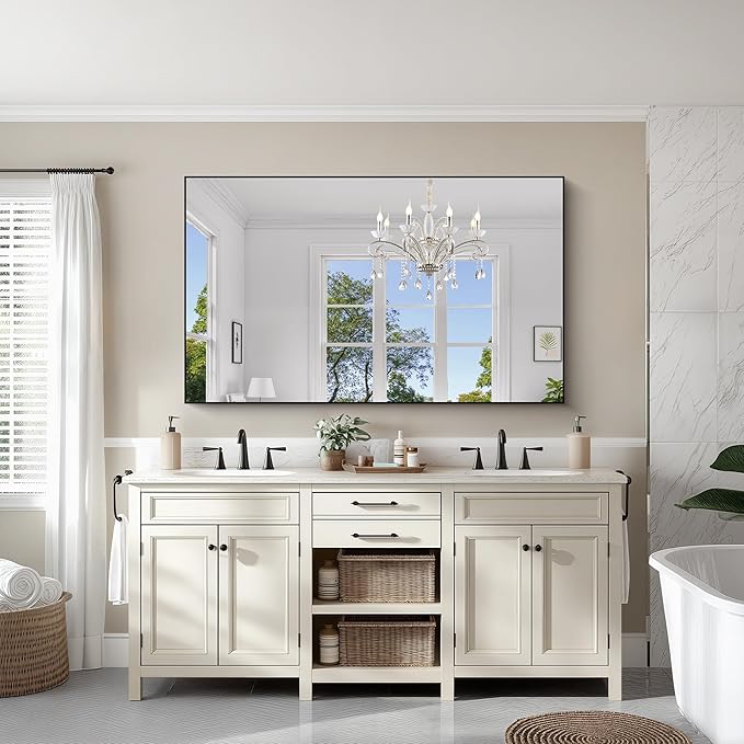 - Modern Design:KOCUUY 60x36 black vanity mirror is with innovative design which gives the wall mirror a more fashion feel. With a classic square corner, the wall mounted mirror allows for creativity and functionality in bathroom, bedroom, entryway and anywhere else. Let your living space be an expression of your personal style, not limited to modern or contemporary, farmhouse or industrial