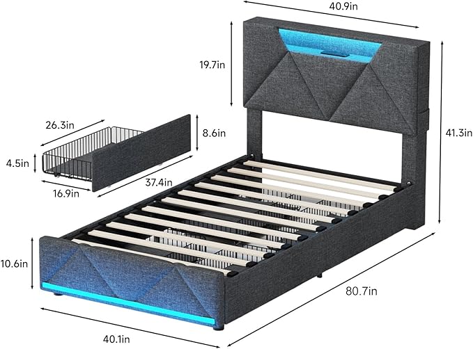 Vabches Twin Bed Frame with Storage Headboard and 4 Drawers,Upholstered Platform with Charging Station and Led Lights,Adjustable Headboard,No Box Spring Needed,Dark Grey