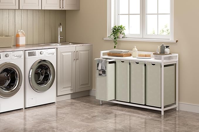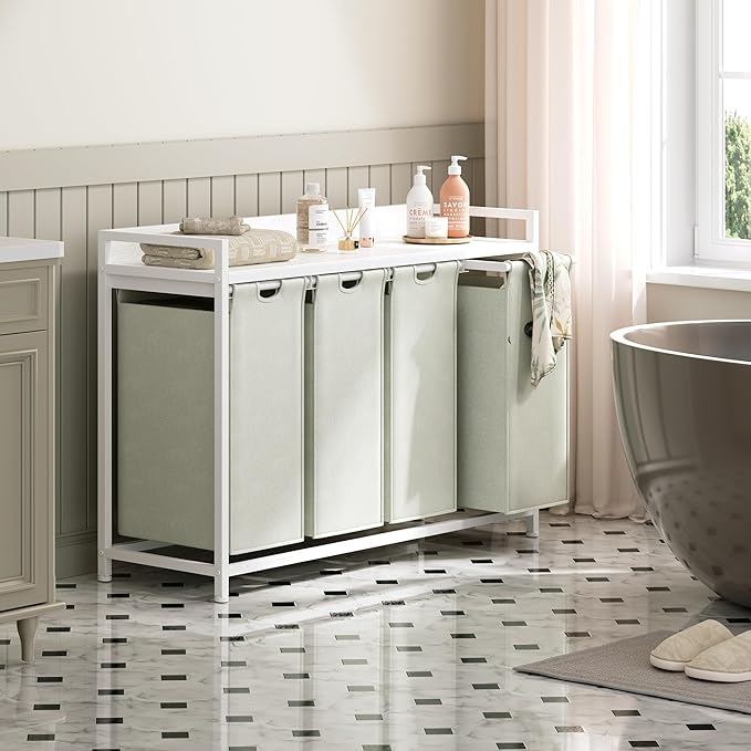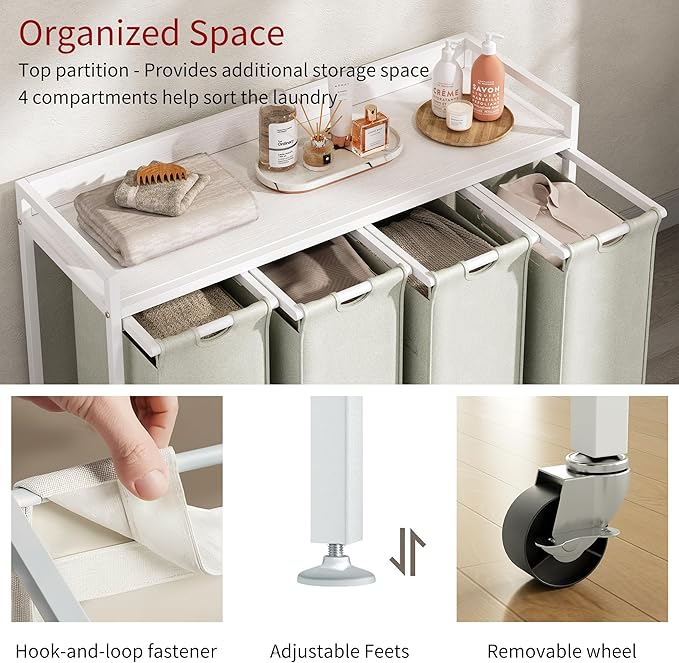 Laundry Hamper with Shelf, Laundry Basket 4 Section, Laundry Sorter with Pull-Out Removable Large Bags and Movable Wheels, Metal Frame, 4 x 15.87 Gallons (60L), White PF07XLW
