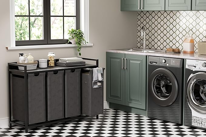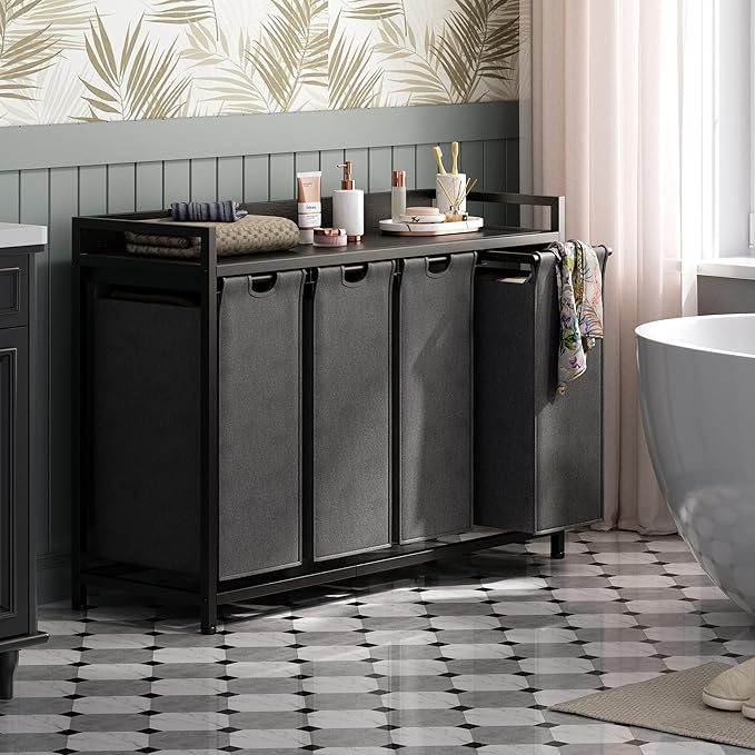 Laundry Hamper with Shelf, Laundry Basket 4 Section, Laundry Sorter with Pull-Out Removable Large Bags and Movable Wheels, Metal Frame, 4 x 15.87 Gallons (60L), Black and Gray PF07XLB