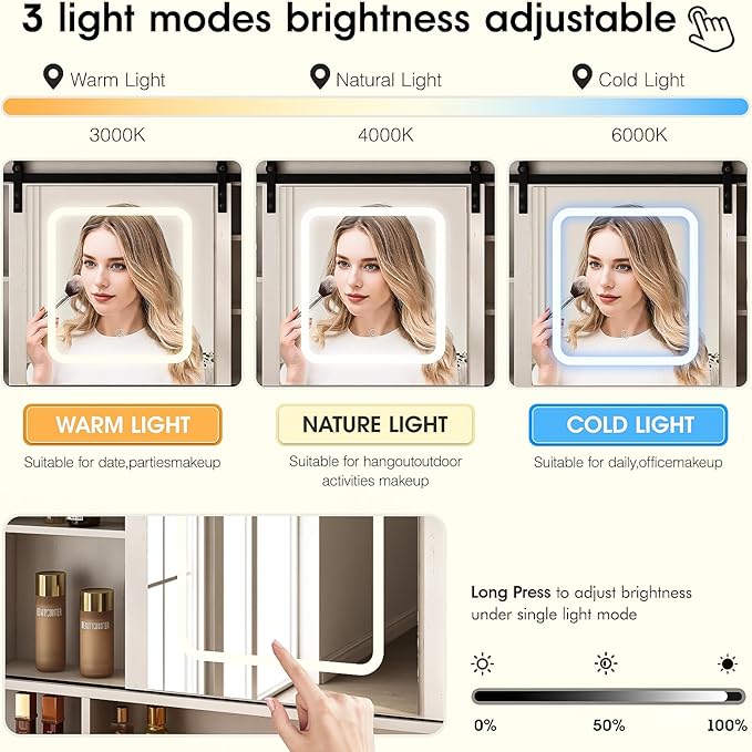 - 【Touch Control Sliding Lighted Mirror】Gently touch the button to adjust 3 color modes, Long press to adjust brightness. Slide the mirror to either side you like freely making your daily beauty rituals effortless and enjoyable