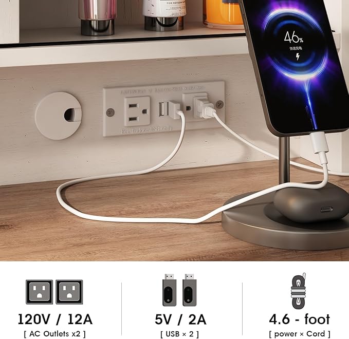 - 【Farmhouse Vanity with Charging Station】The design blends farmhouse elements,This make up vanity table comes with a power strip, which includes 2 standard plug sockets and 2 USB ports. Easily connect a hair dryer, or curling iron, and charge your phone or other electronics.