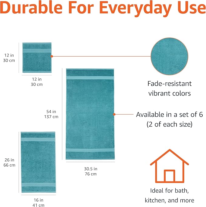 Amazon Basics Fade Resistant Bath, Hand and Washcloth Towel Set, 100% Cotton, Set of 6, 30 x 54 inches, Teal Green