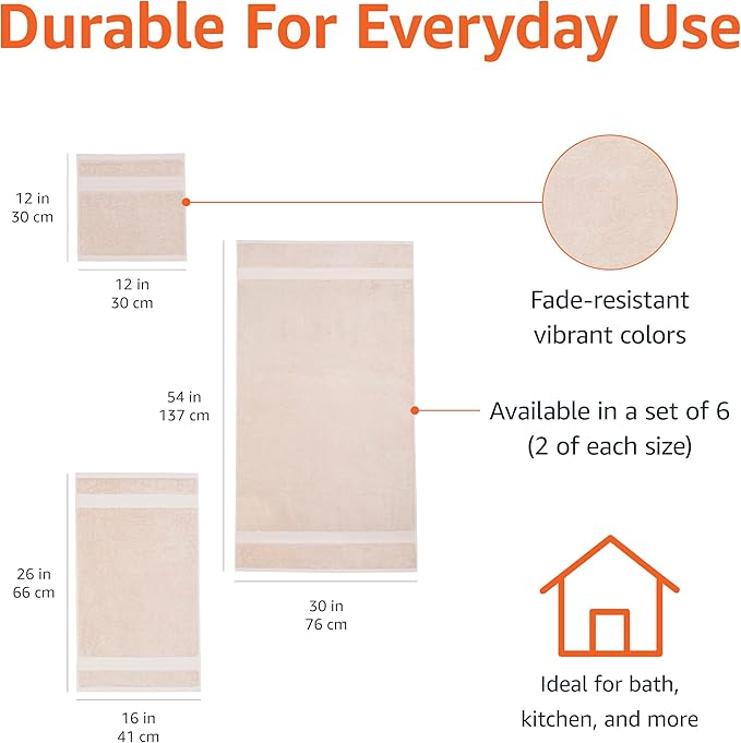- Set of 6 towels includes (2) 30 x 54-inch bath towels, (2) 16 x 26-inch hand towels, and (2) 12 x 12-inch washcloths