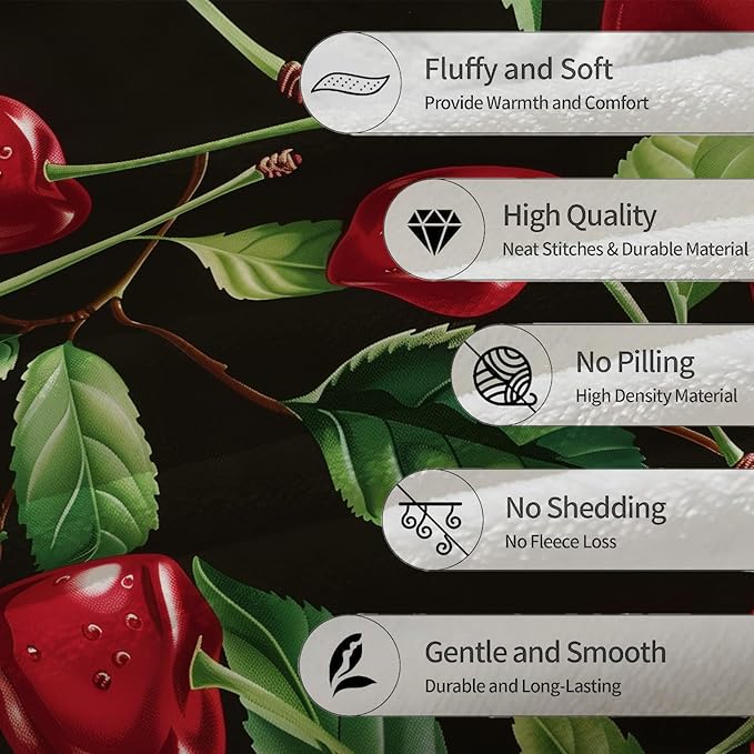 - [Charming Cherry Pattern]The blanket features a vibrant cherry pattern set against a sleek black background. The design includes luscious red cherries and lush green leaves, creating a striking contrast that is both playful and stylish. This eye-catching pattern adds a touch of nature-inspired charm to any room, making it a delightful addition to your home decor.