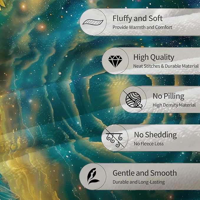 - [Stunning Sunflower Galaxy Design]The blanket features a breathtaking design of sunflowers set against a mesmerizing galaxy background. The vivid depiction of a star-filled sky swirling around a bright sun above a field of sunflowers brings a sense of wonder and beauty to your space. This unique pattern adds a touch of magic and nature-inspired elegance to your home decor.