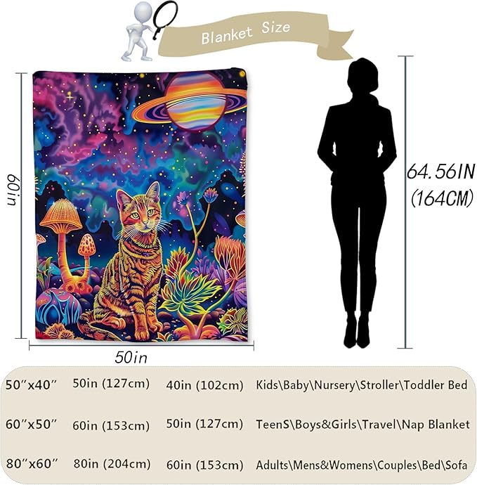 - [Unique Cosmic Cat Design]The standout feature of this blanket is its mesmerizing design, showcasing a cosmic cat sitting amidst a vibrant, psychedelic landscape filled with colorful plants, mushrooms, and a stunning view of Saturn in the background. This eye-catching and artistic pattern adds a touch of whimsy and creativity to any room, making it a perfect statement piece for cat lovers and space enthusiasts alike.