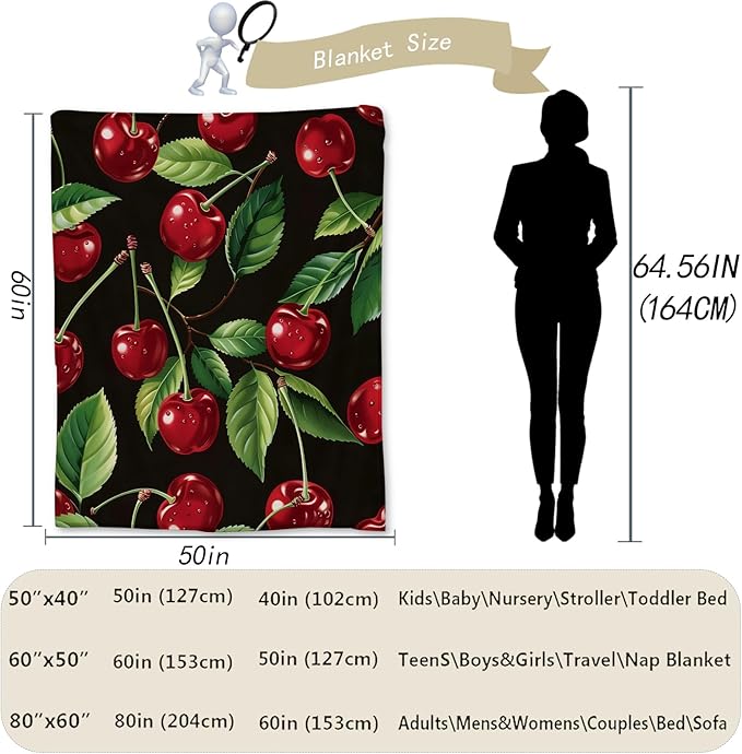 Cherry Blanket - Ultra Soft, Fluffy, Lightweight Fruit Flannel Throw Blankets for Couch, Bed, Travel, Outdoor - Cozy, Fuzzy Home Decor, for Adults Kids Women Boys Girls 60×50 in