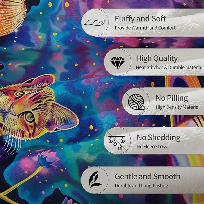 - [Unique Cosmic Cat Design]The standout feature of this blanket is its mesmerizing design, showcasing a cosmic cat sitting amidst a vibrant, psychedelic landscape filled with colorful plants, mushrooms, and a stunning view of Saturn in the background. This eye-catching and artistic pattern adds a touch of whimsy and creativity to any room, making it a perfect statement piece for cat lovers and space enthusiasts alike.