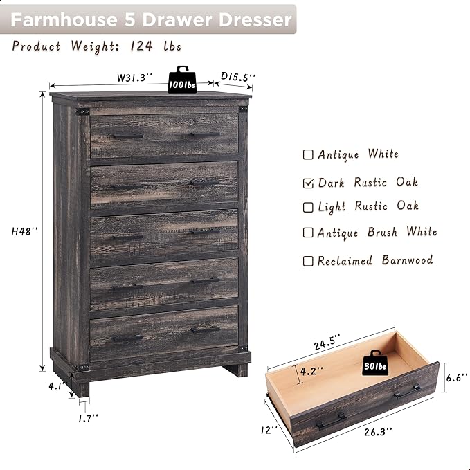 - Richly Rustic Aesthetic: This 5 drawer dresser’s crisp, clean and quaint profile is enriched with a striking weathered oak grain with distressed finish and thick plank styling for that much more rustic warmth. Antiqued nailhead trim and handle pay homage to country farmhouse, making for a chic look loaded with charm, eamlessly complementing any furniture and decor style.