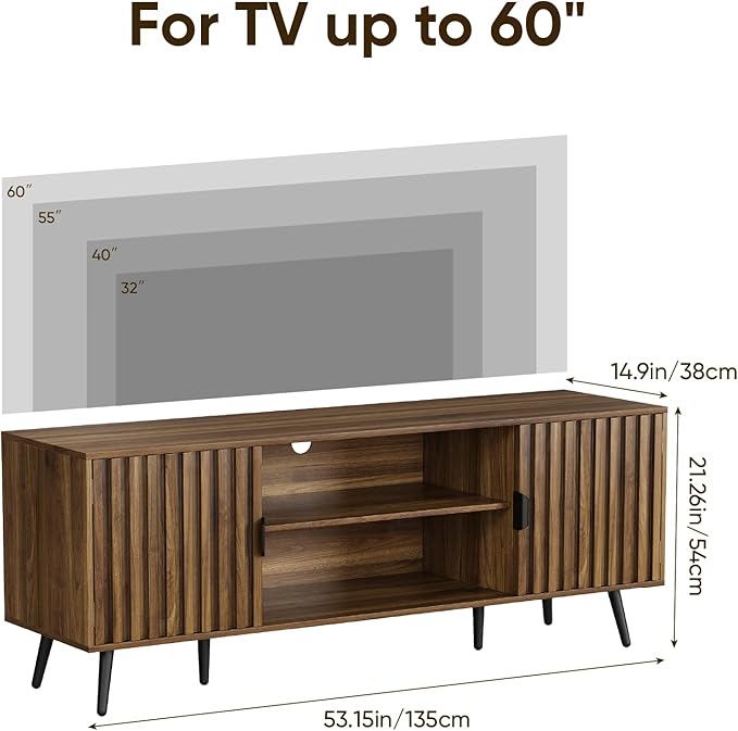 - 【Perfect Size】This wooden entertainment center is designed to accommodate TVs ranging from 55" to 60", with a tabletop measuring 53.14" x 15.7". It fits perfectly in your home, striking a balance between being neither too bulky nor too crowded. It provides a sturdy and stable platform for a 55-inch TV, ensuring an optimal viewing experience in terms of height. Moreover, its depth is spacious enough to accommodate the TV along with other media devices, offering ample storage space to keep your home entertainment area organized