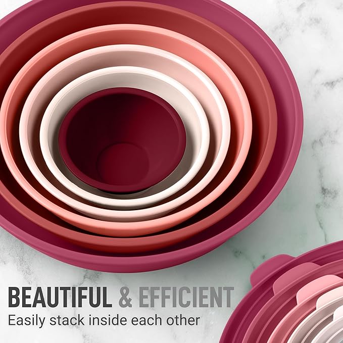 - STACKABLE, EASY TO CLEAN DESIGN: These nesting mixing bowls for kitchen can be stacked on top of each other to save space. The plastic bowls with lids are top-rack dishwasher friendly and can also be hand washed with soap and water (avoid the use of abrasive sponges).