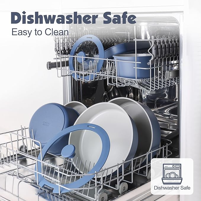 - Dishwasher Safe - Cleaning is a breeze. Professional wear-resistant design for the bottom of the pan set that prevents black residue even when used in the dishwasher.