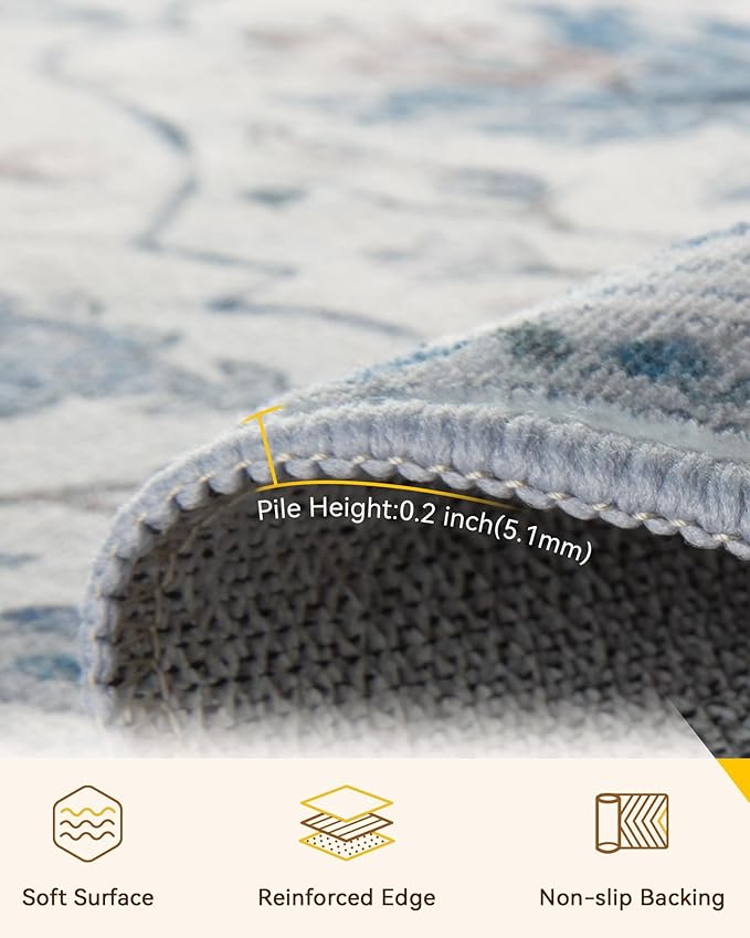 Area Rugs 4ft Washable Non-Slip, Floral Vintage Distress Print Pattern Medallion Carpet for Living Room Bedroom Dining Room, Light Blue Navy Beige Gray White