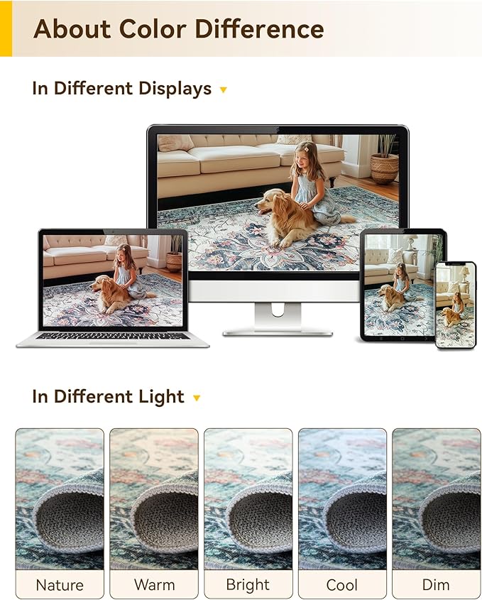 - Soft Surface and Non-slip Backing: this area rug is made of low-pile soft material which feels great underfoot. With its low pile, the fibers are short and tightly packed together, creating a smooth and even surface. Your pets gonna love it. And the non-slip backing makes the rug stays in place.