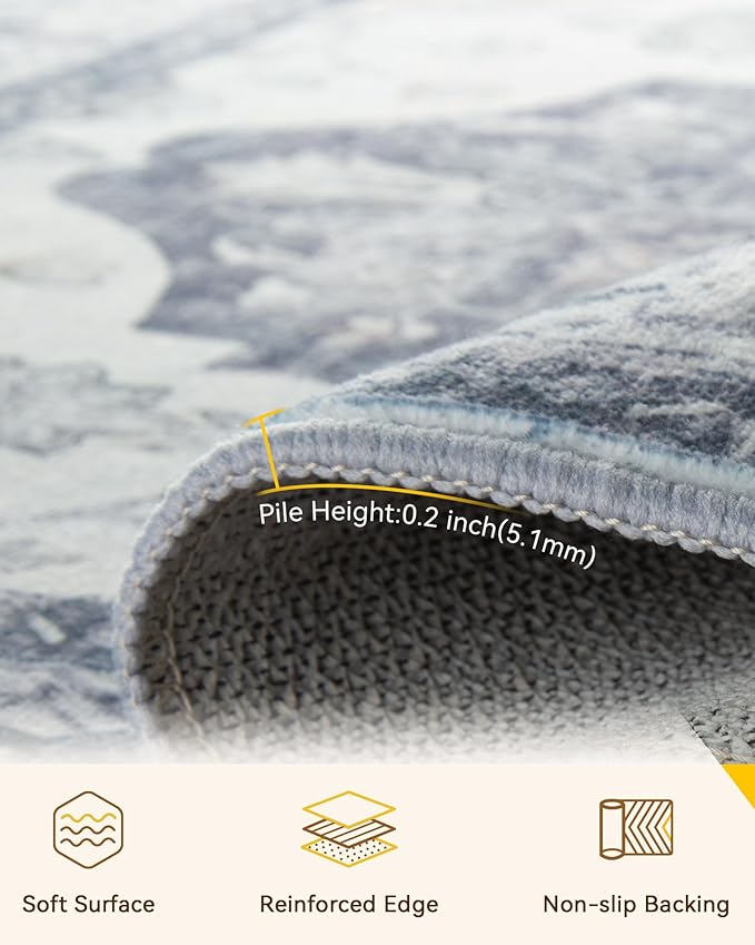 - Soft Surface and Non-slip Backing: this area rug is made of low-pile soft material which feels great underfoot. With its low pile, the fibers are short and tightly packed together, creating a smooth and even surface. Your pets gonna love it. And the non-slip backing makes the rug stays in place.