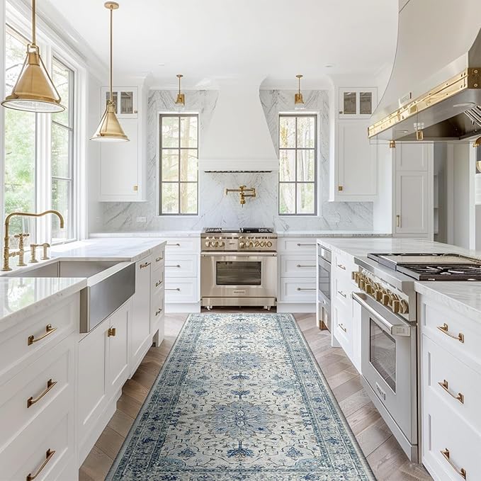 Area Rugs 2'x8' Washable Non-Slip, Floral Vintage Distress Print Pattern Medallion Carpet for Living Room Bedroom Dining Room, Light Blue Navy Beige Gray White